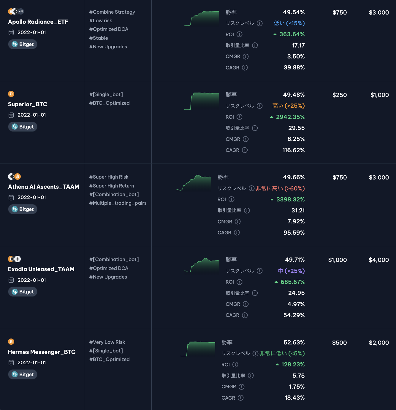 ユーザーは、投資目的、リスク許容度、投資期間に基づいて最も適切なボットを選択できます。